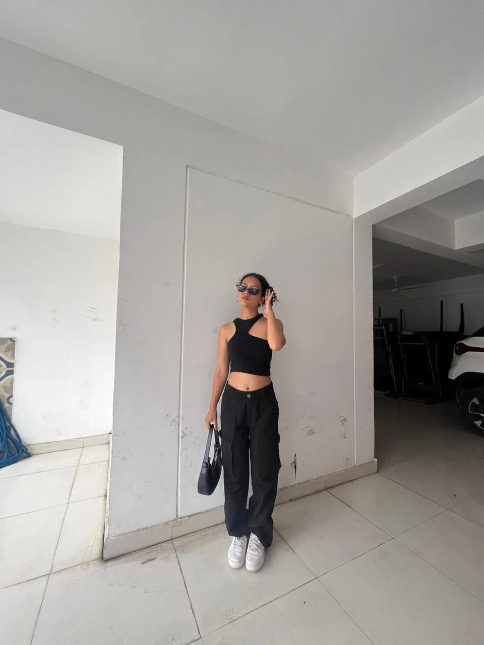 High-waist straight-fit cargo denim with utility-inspired flap pockets on the sides. Features a zip fly with button closure, belt loops, and back patch pockets.